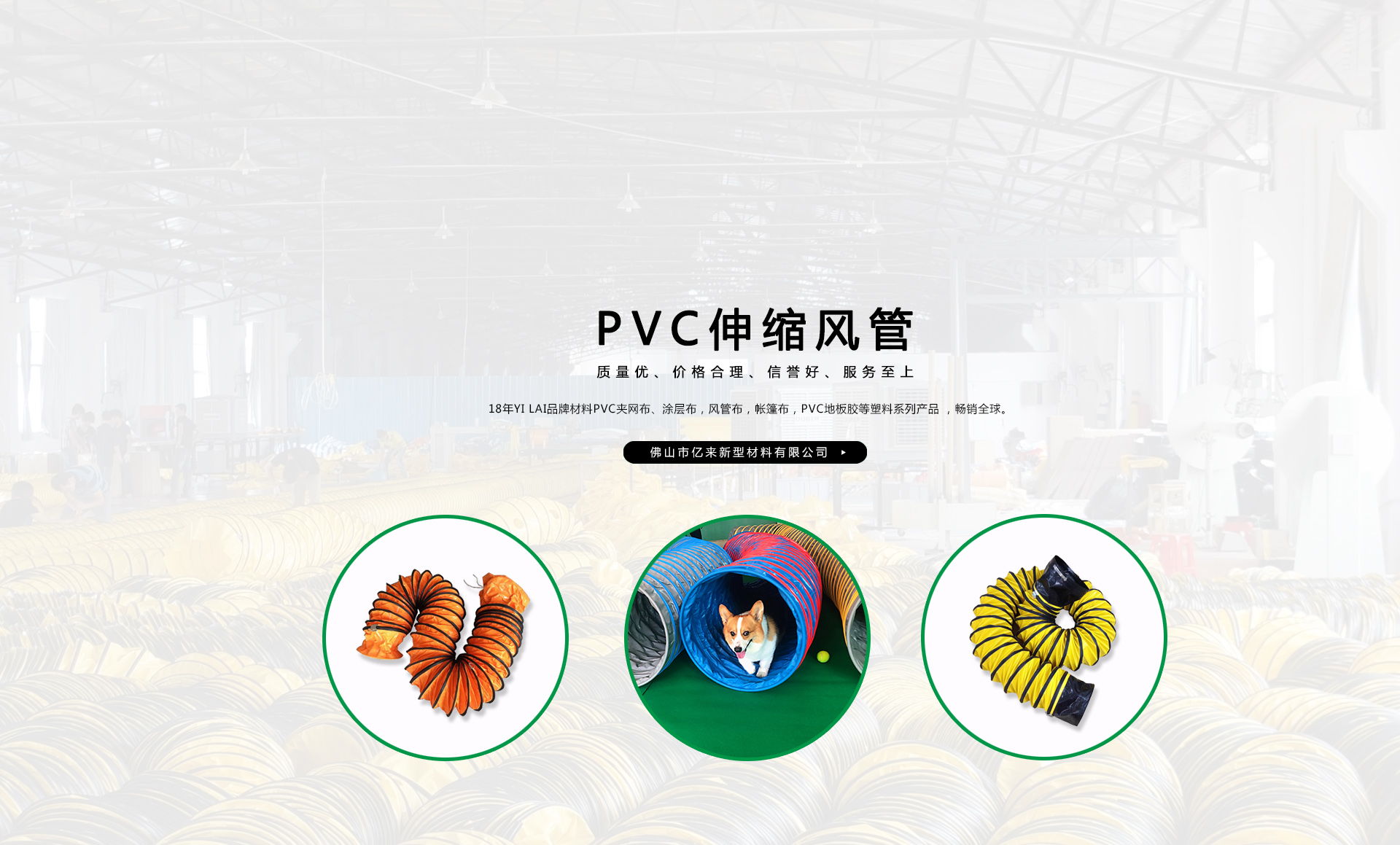 創建“YILAI品牌”近20年來,產品質量穩定提高,生產及經營的產品包括PVC夾網布、PVC彩條布、PVC風管布、PVC涂層布、PVC籬笆圍護欄布、PVC透明夾網布、PVC伸縮風管、車縫風管、寵物管、耐高溫風管、地下室通風管,保溫通風管、空調排風管、正負壓通風管、三通/四通排風管、防靜電風管、隧道風管、PVC地板膠等系列產品在市場上得到廣大客戶認可,暢銷歐美、東南亞、非洲、中東等國外市場。